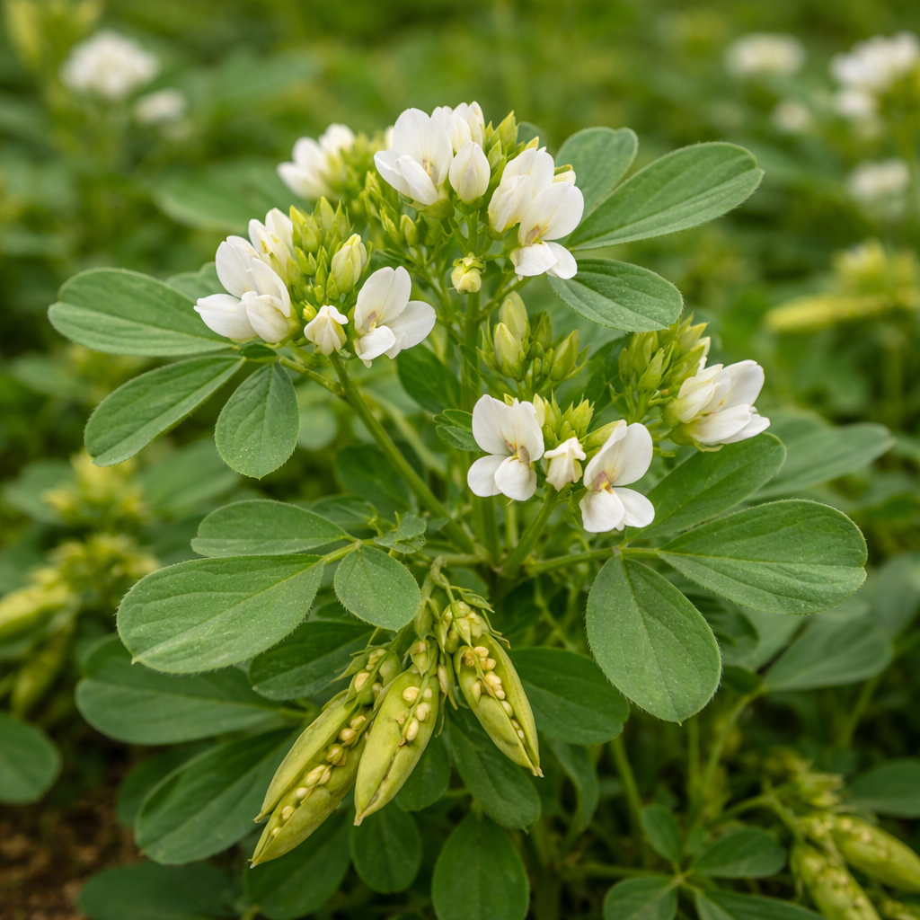 Fenugreek (Trigonella foenum-graecum) is a small annual plant belonging to the legume family (Fabaceae). Native to the Mediterranean region, the Middle East, and South Asia, the plant produces long pods containing aromatic seeds.